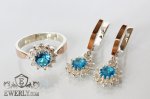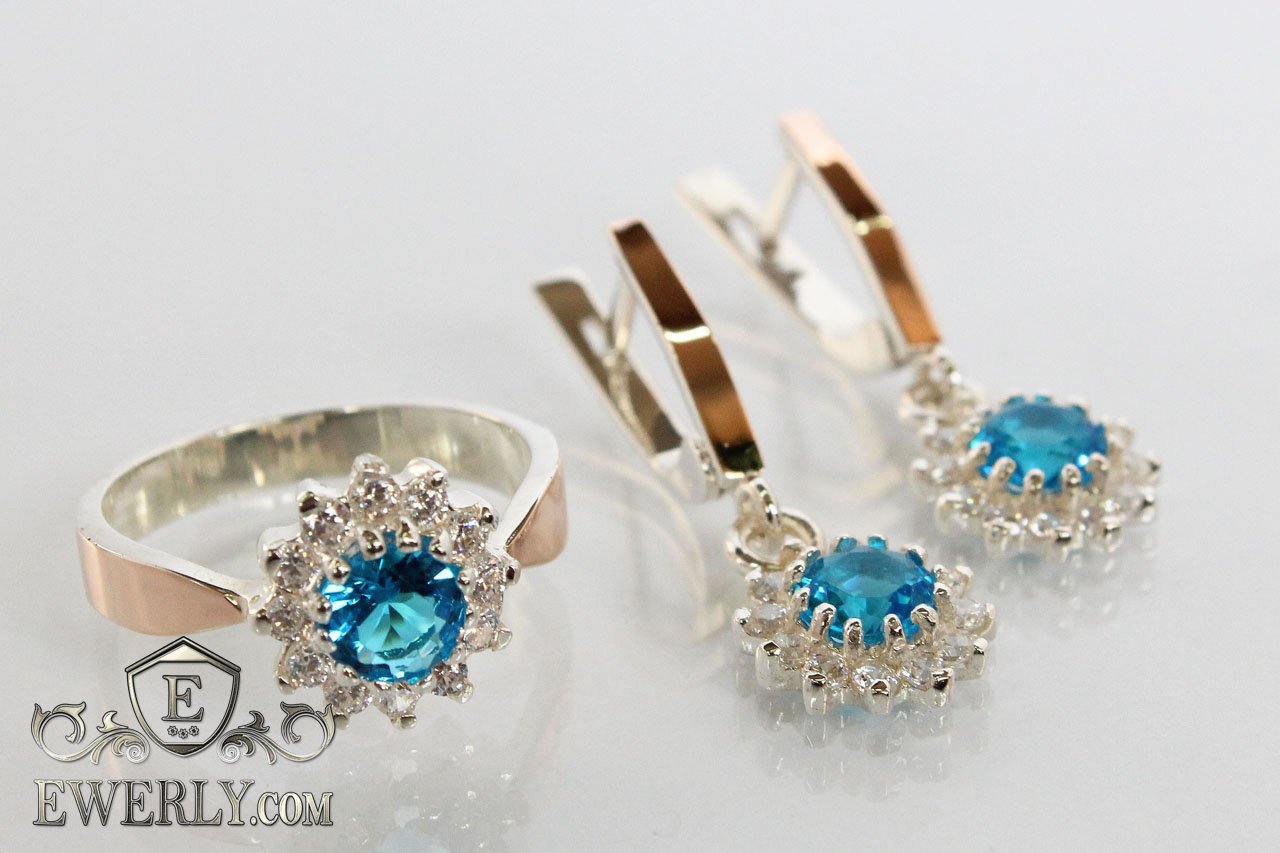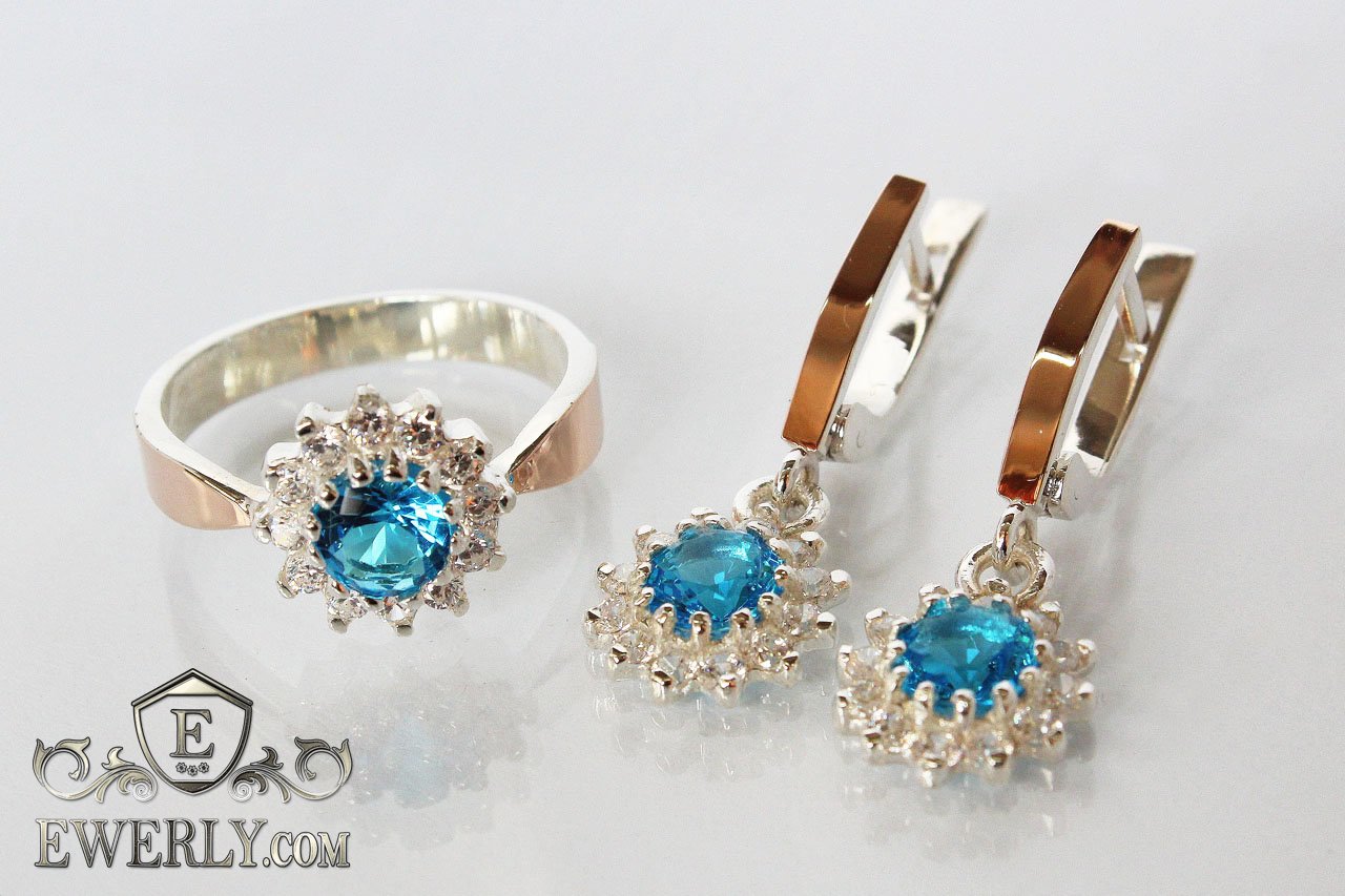 Жіночий комплект: срібний перстень і сережки з блакитним камінням