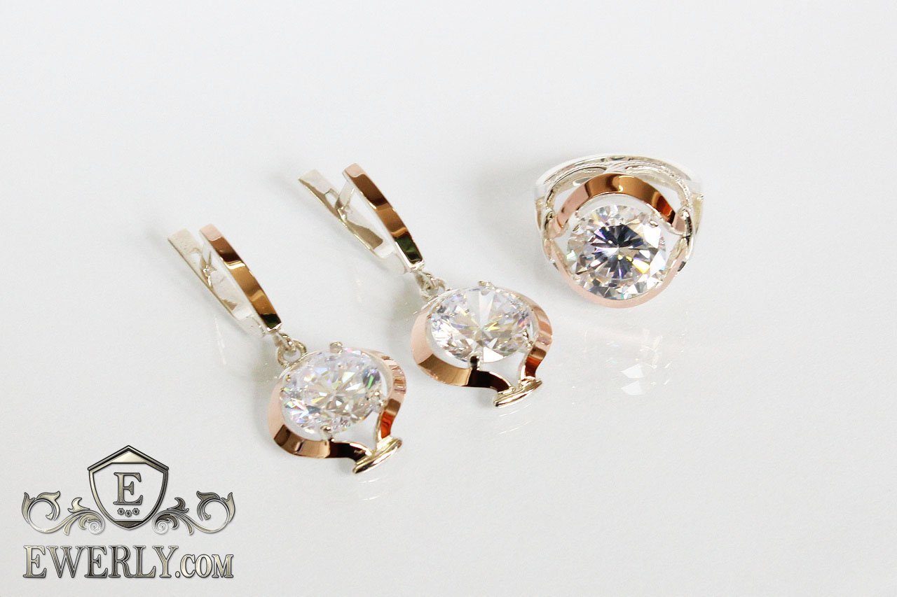 Жіночий комплект: срібний перстень і сережки з білими фіанітами