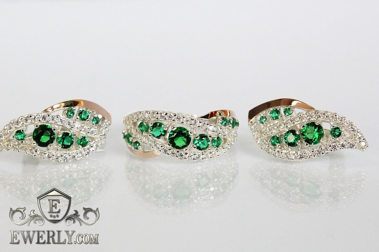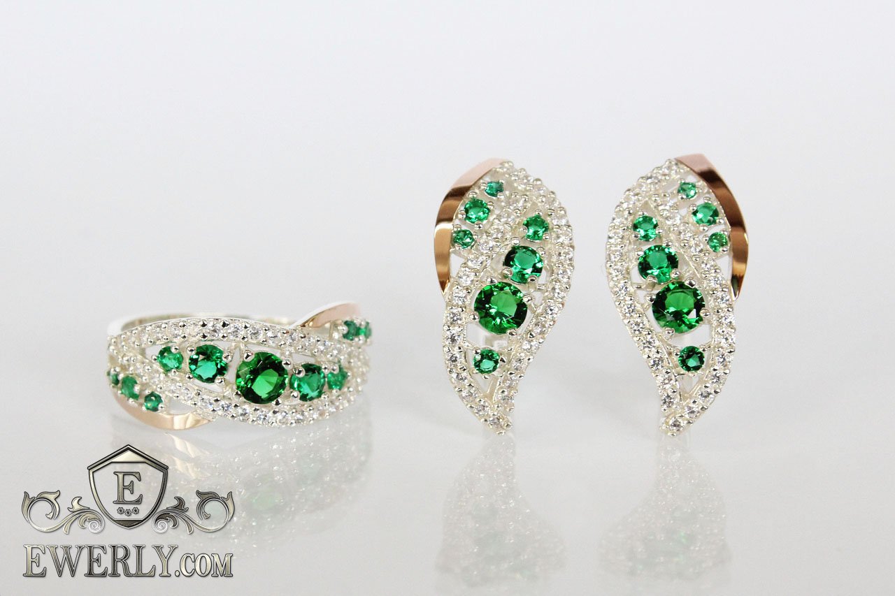Жіночий набір: сережки і кільце зі срібла з золотом і зеленими каменями
