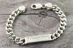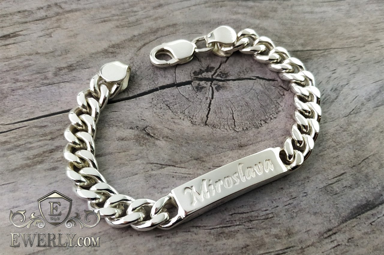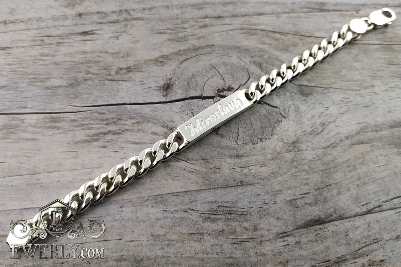 Повновісний браслет. На фото зображений Панцирний срібний браслет із пластиною, дана пластина має довжину 3 см та гравіювання зверху "Miroslava".