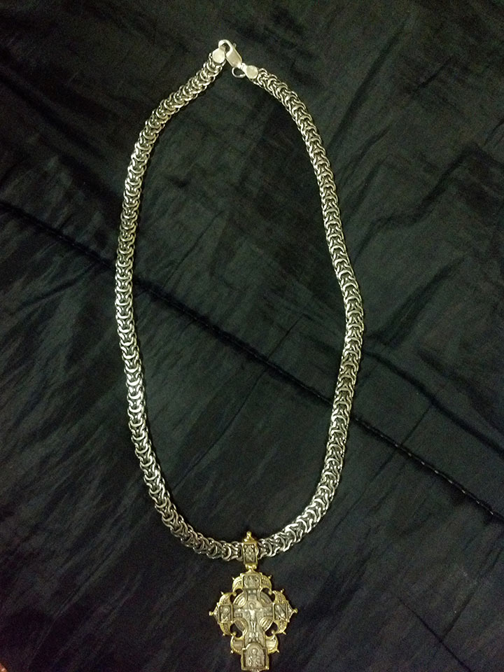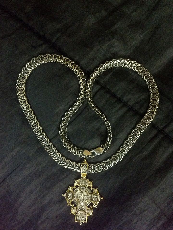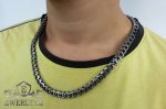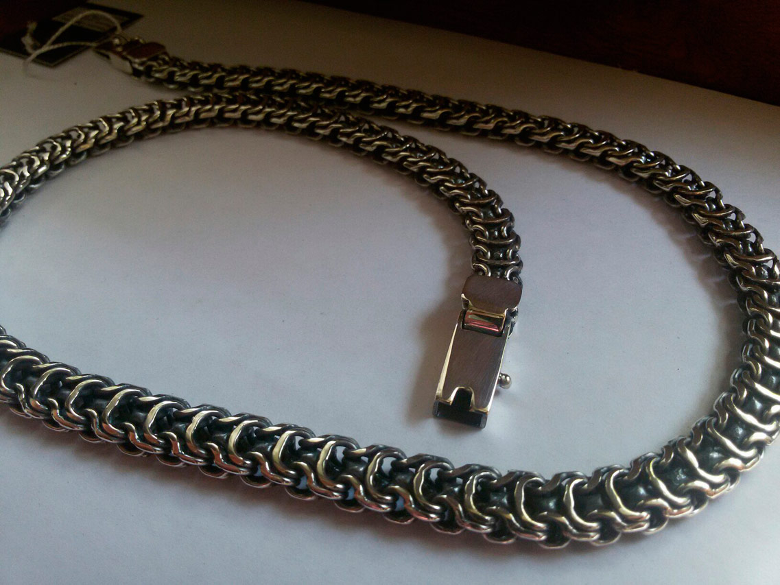 Повновісний ланцюжок. Дуже популярне серед чоловіків «плетіння Рамзес», також на просторах інтернету дане плетіння можна побачити під назвою «Подвійний зворотний Бісмарк». Особливо чоловічу увагу привертають товсті срібні ланцюжки з «Подвійного зворотного бісмарка» з розмірами близькими до розмірів на фото. І тим не менше, якщо такий ланцюжок особисто для Вас виглядає на шиї дуже громіздким або навпаки замалим, то Ви без особливих зусиль можете відкоригувати практично будь-який її параметр під свій смак, в тому числі є можливість вибрати як з чорнінням, так і без чорніння або ж з родіюванням.
