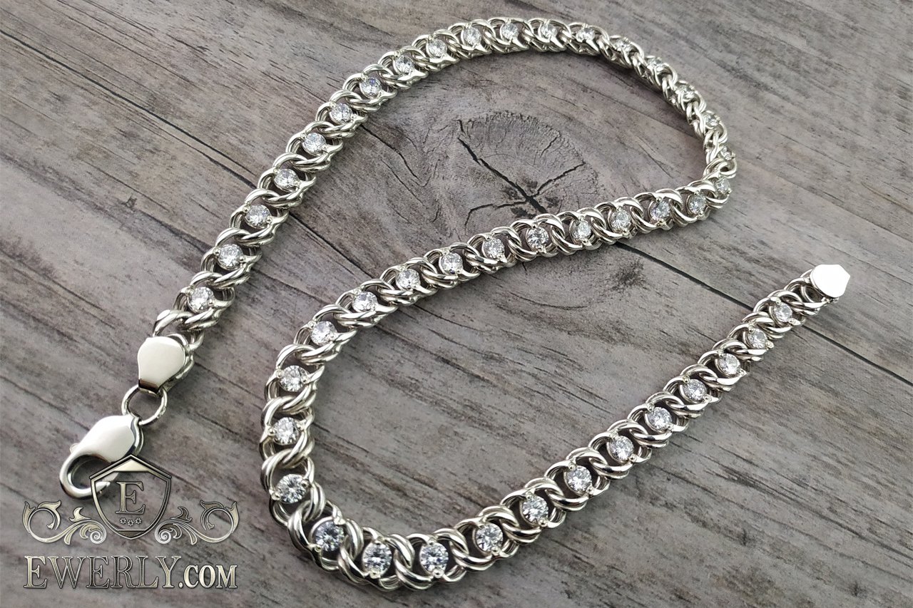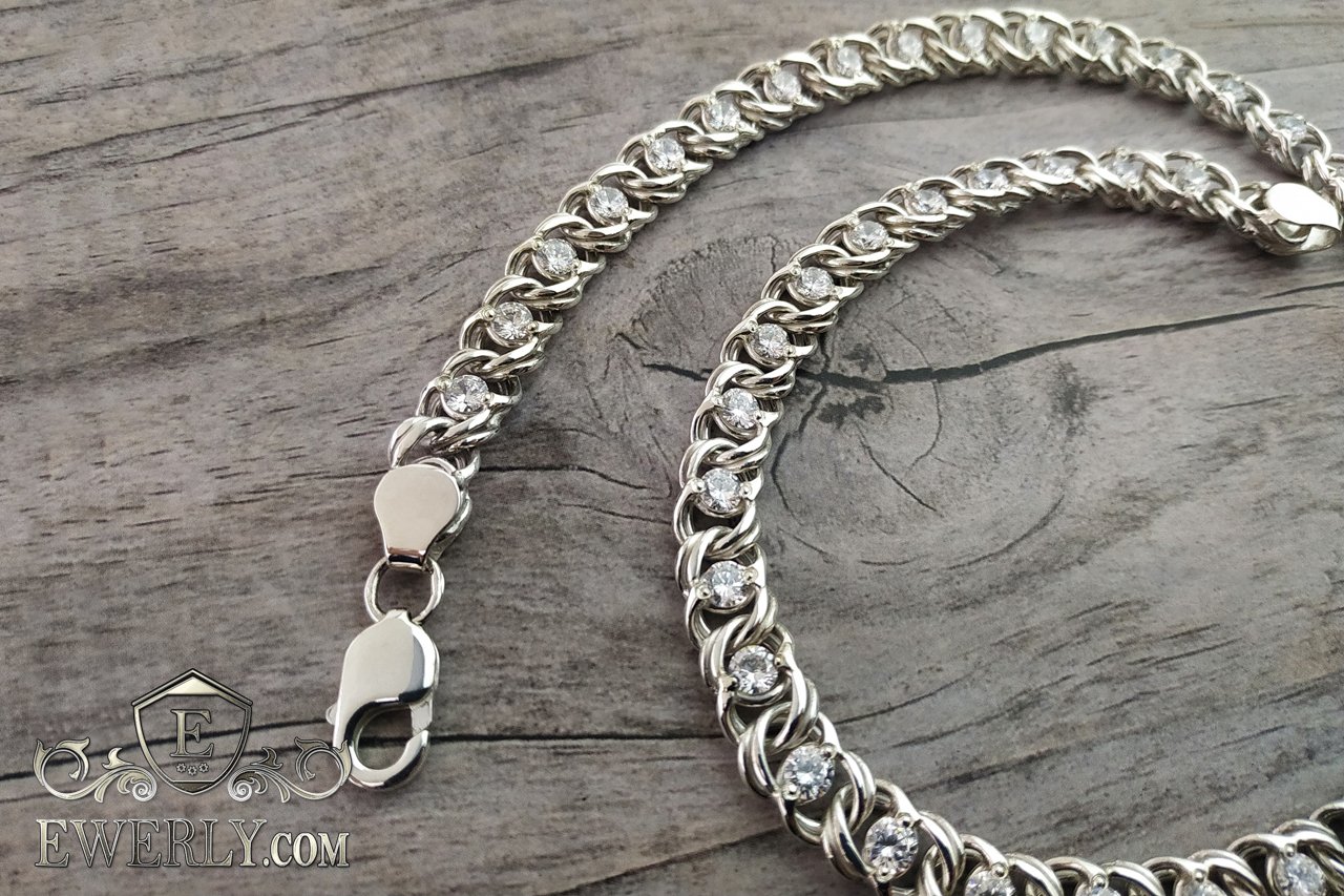 Повновісний ланцюжок. Срібний ланцюжок з плетіння Арабський Бісмарк зі вставками: білими каменями (фіанітів).