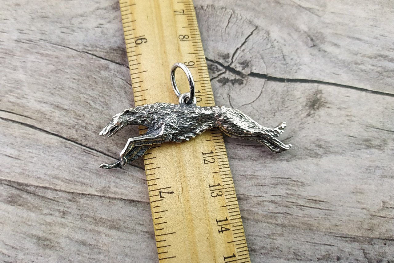 На фото зображений срібний кулон у вигляді собаки - російський хорт зі срібла 925 проби. Розміри підвіски вказані без урахування вушка,