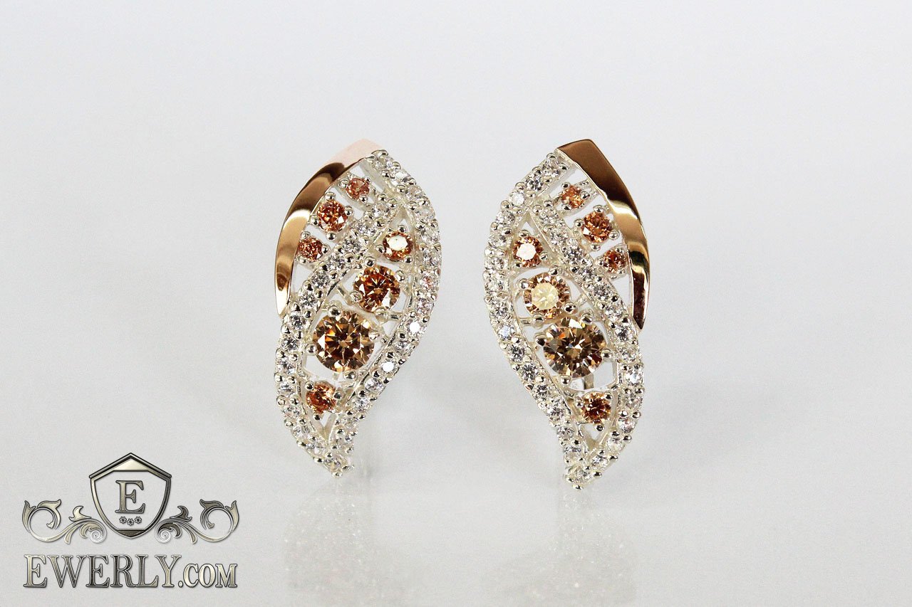 Жіночі сережки зі срібла з золотом і камінням (колір-шампань)