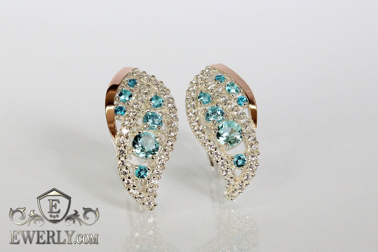 Жіночі сережки зі срібла з золотом і світло-блакитним камінням