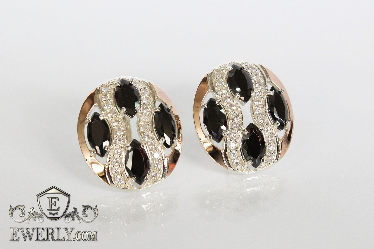 Сережки зі срібла 925 проби для жінок з камінням чорного кольору