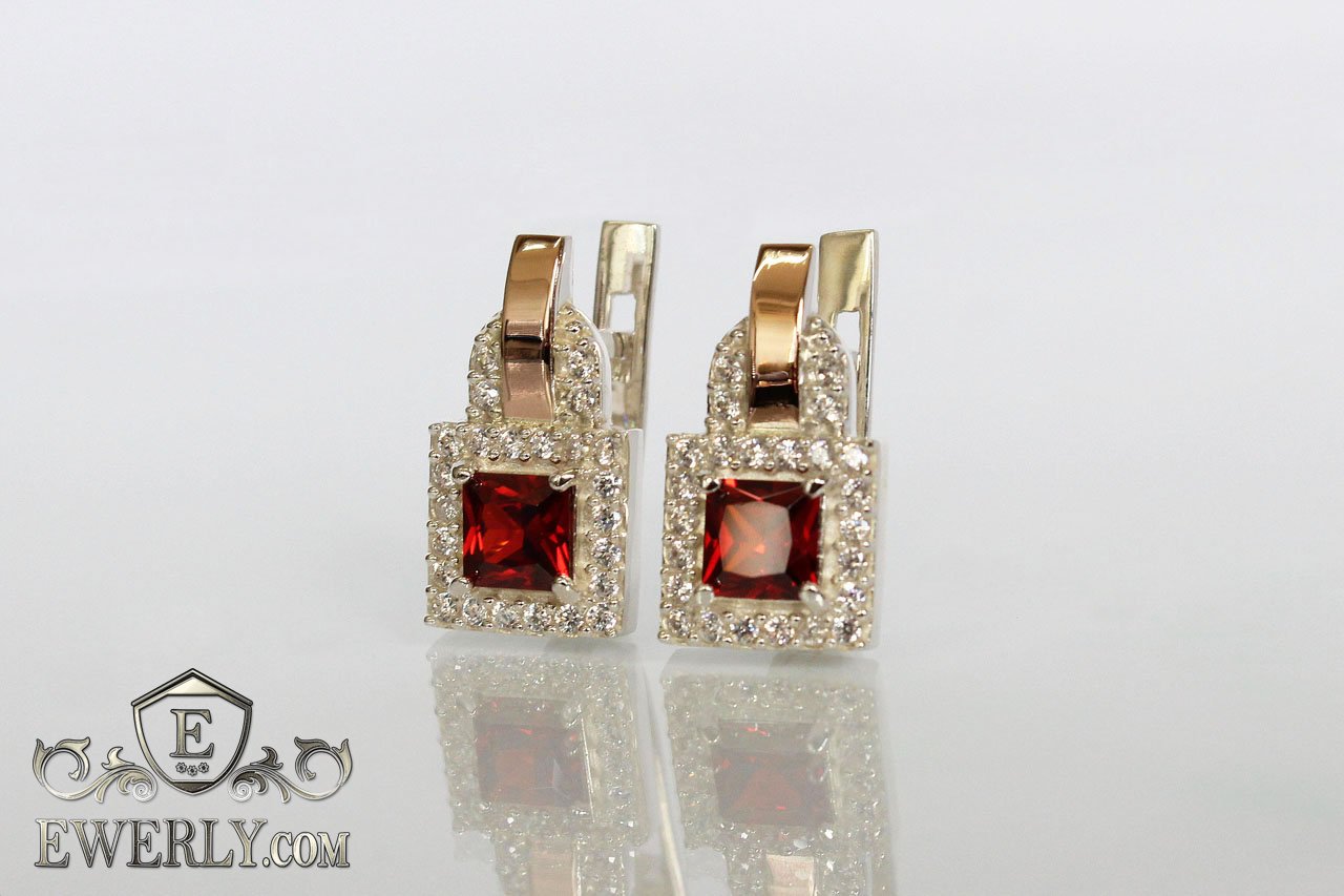 Срібні сережки із золотими вставками і фіанитамі (гранатовий колір)
