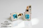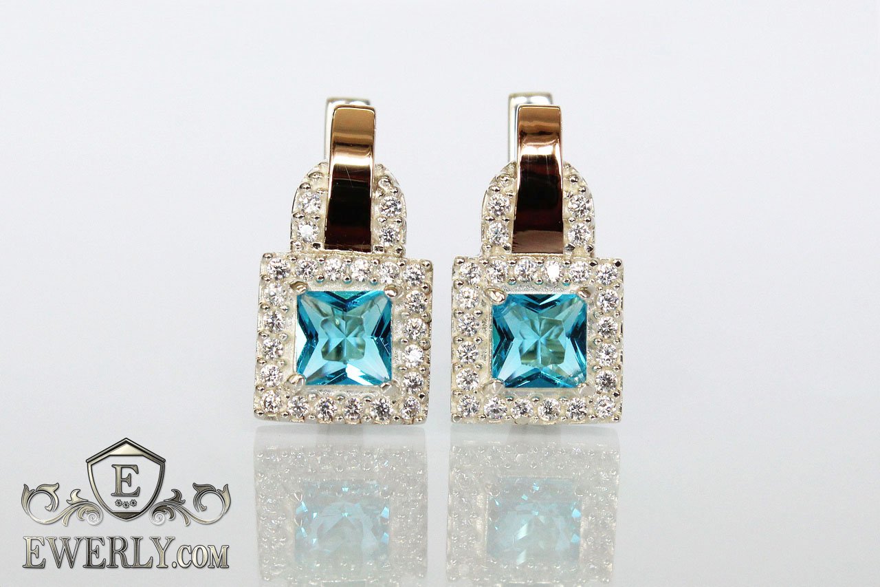 Срібні сережки із золотими вставками і світло-блакитними фіанитами