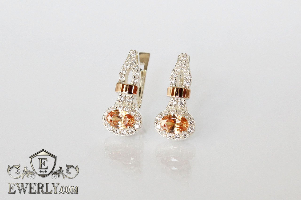 Сережки - краплі зі срібла з золотими пластинами (фіанити - шампань)
