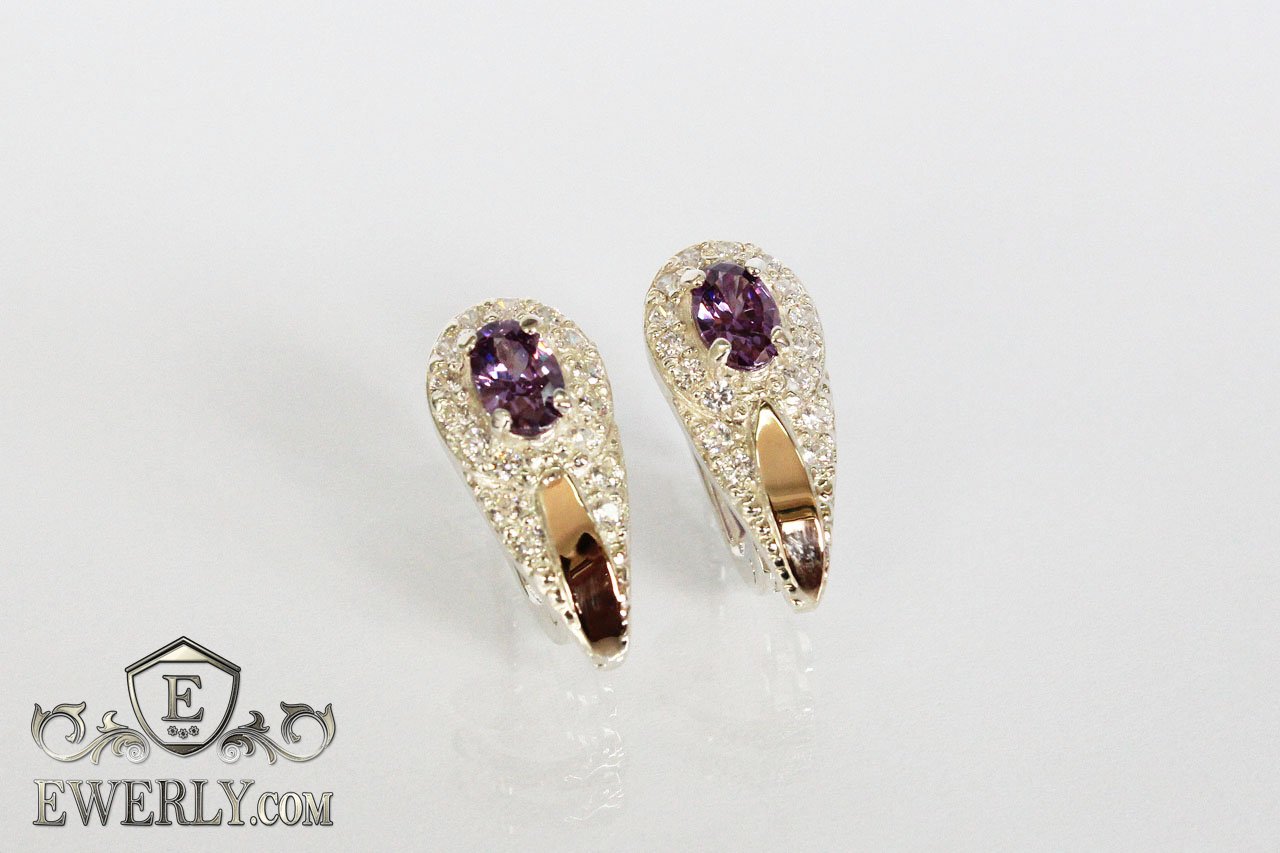 Срібні сережки - краплі з золотом і камінням (колір аметиста)