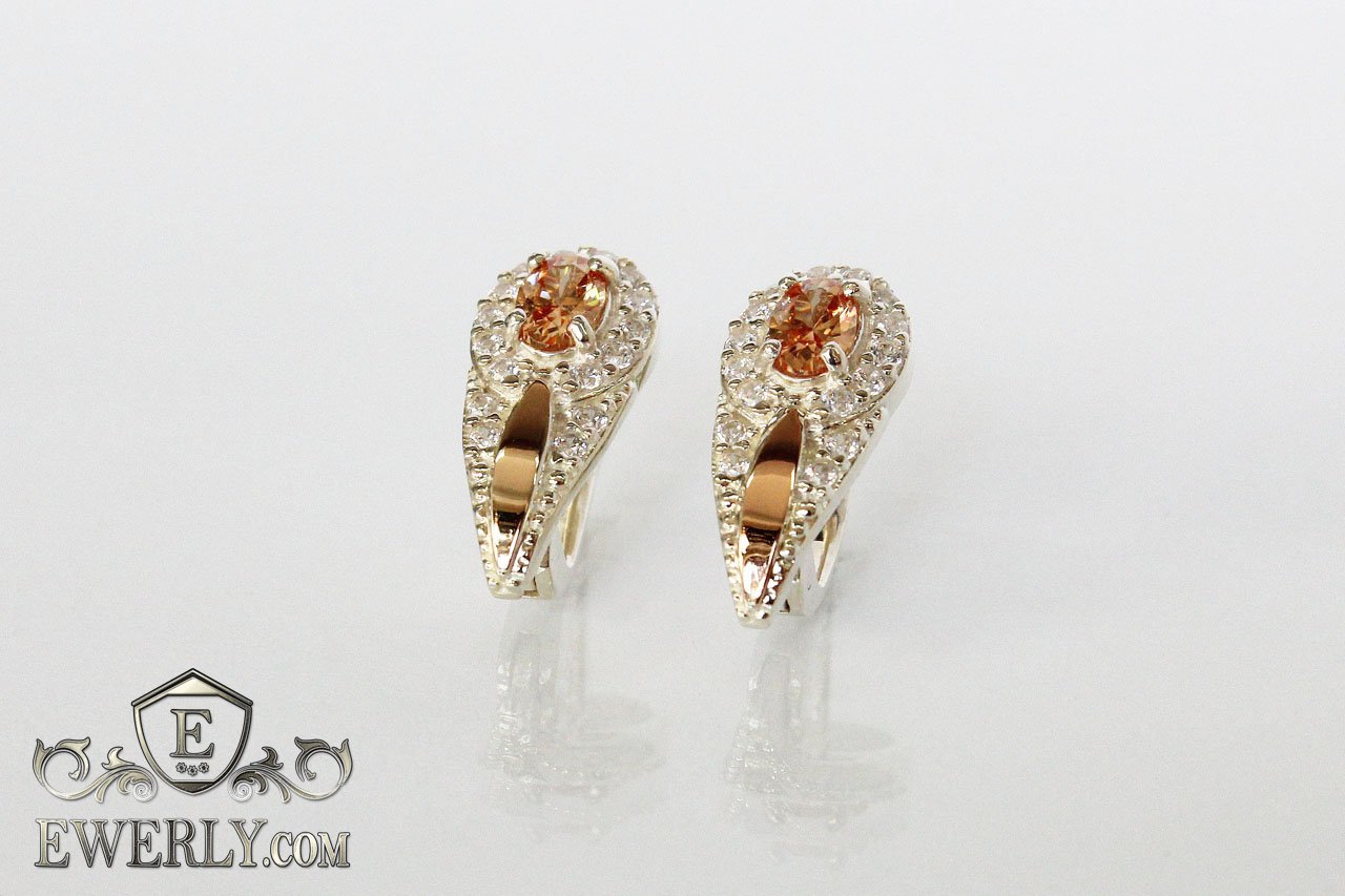 Срібні сережки - краплі з золотом і камінням (колір шампань)