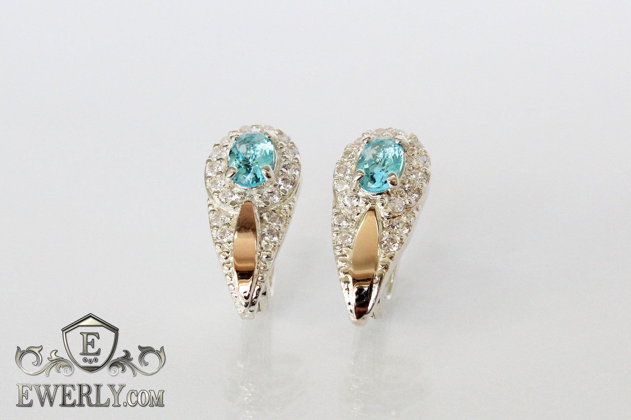 Сережки - краплі зі срібла з золотом і світло-блакитним камінням