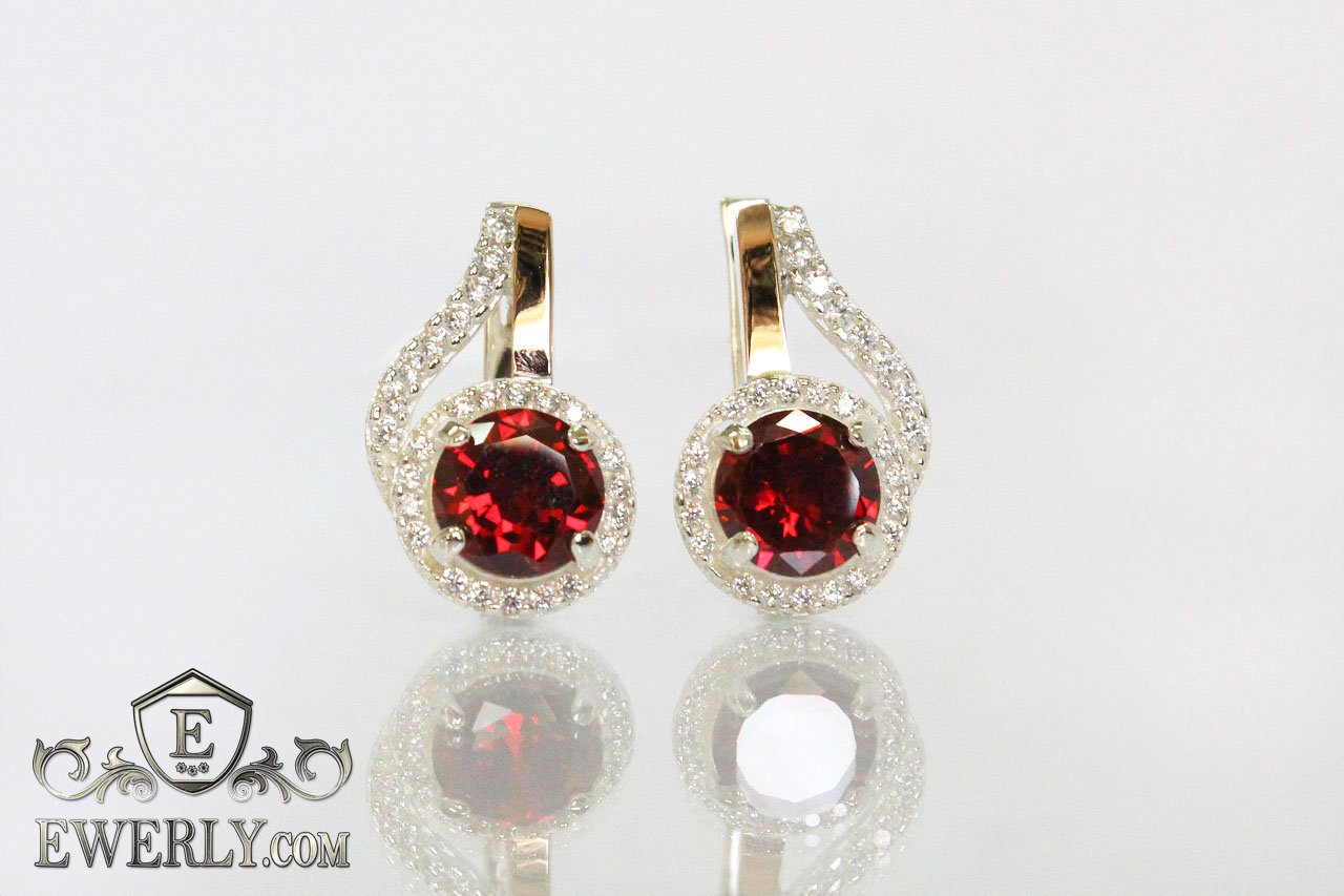 Срібні сережки з гранатовими каменями і золотими вставками для дівчат