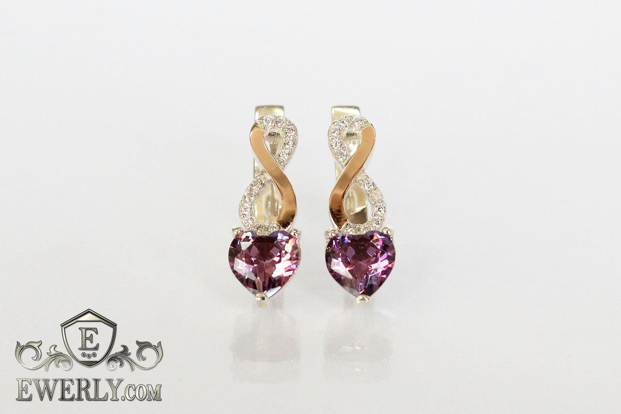 Срібні сережки з серцем і золотом (камінь кольору-аметист)