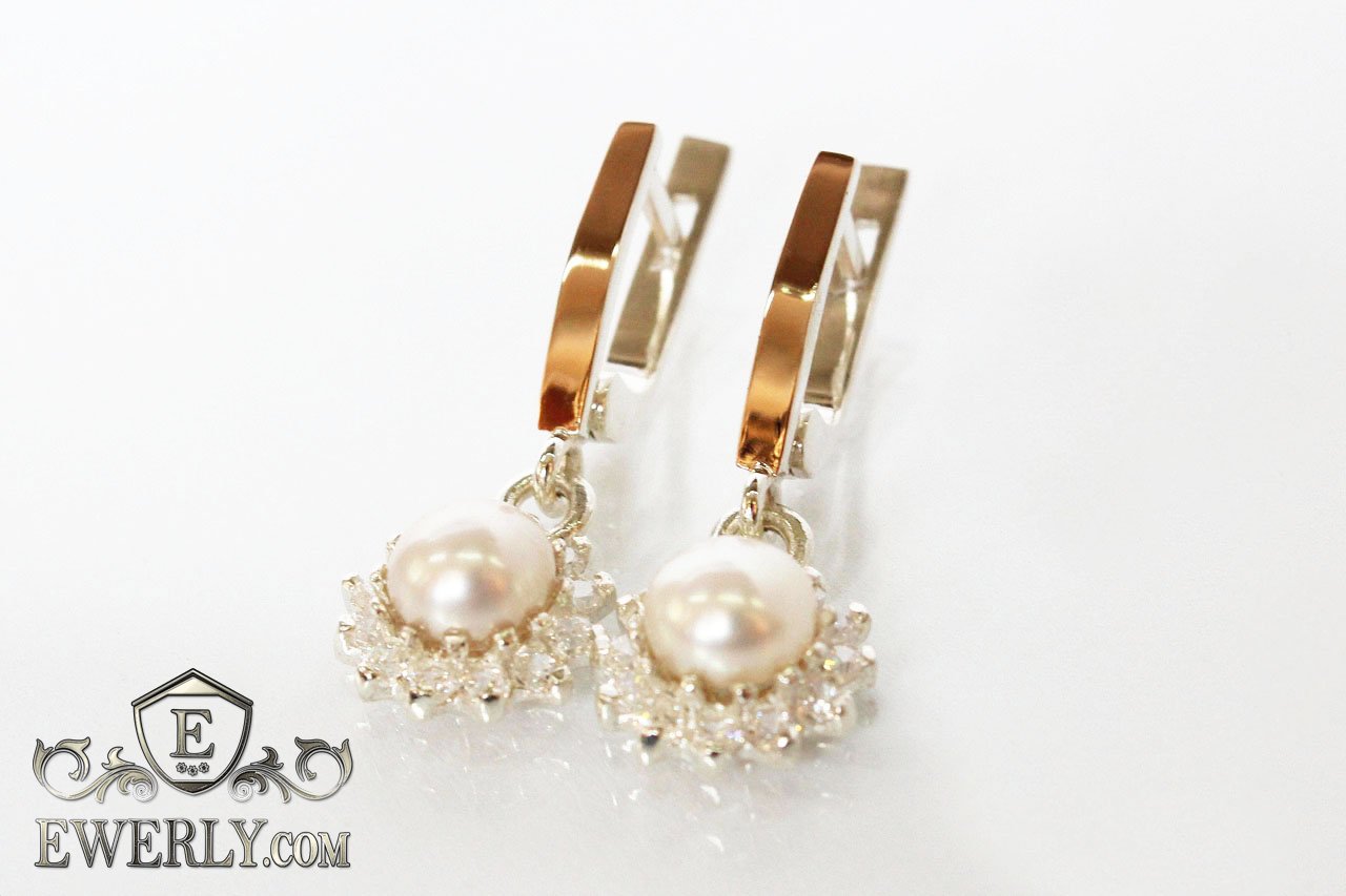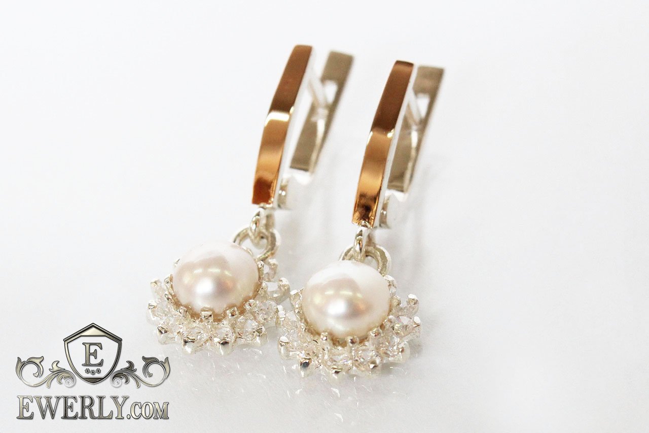 Срібні сережки з камінням - білими фіанитами у вигляді перлів