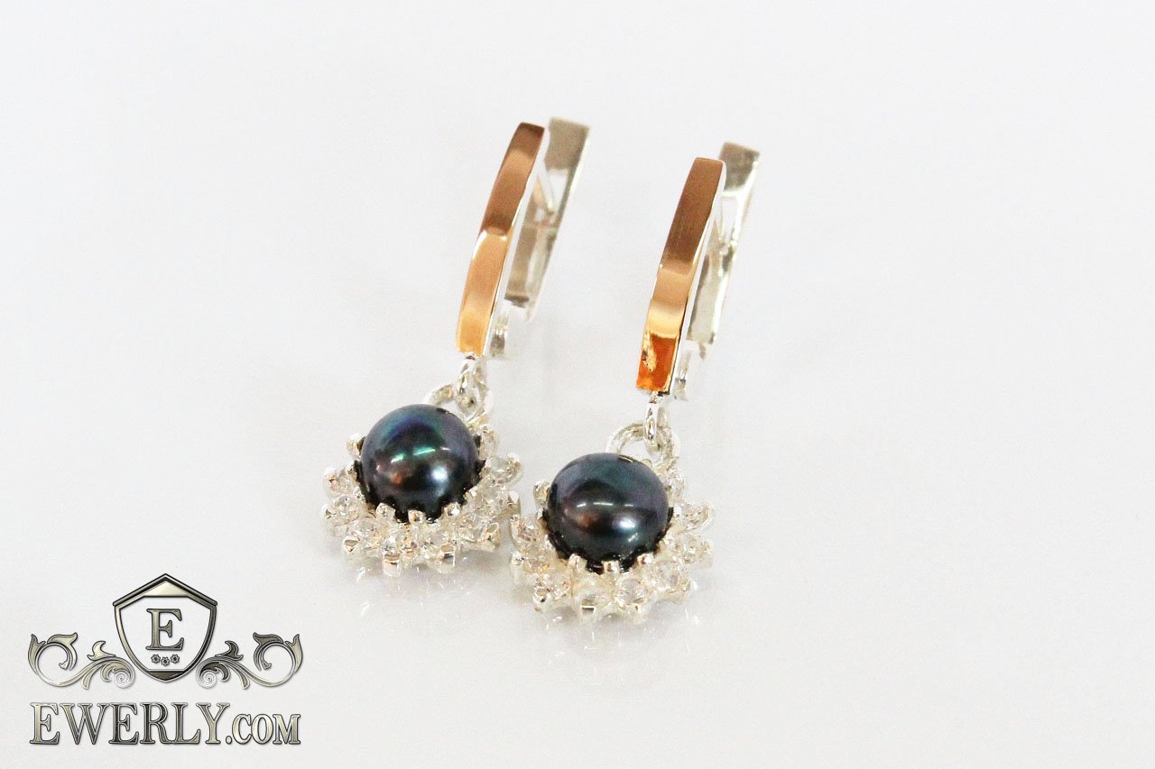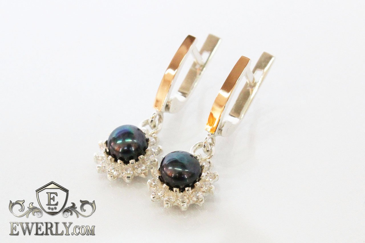 Срібні сережки з камінням - чорними фіанитами у вигляді перлів