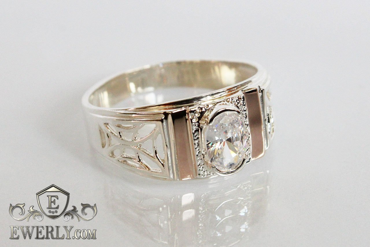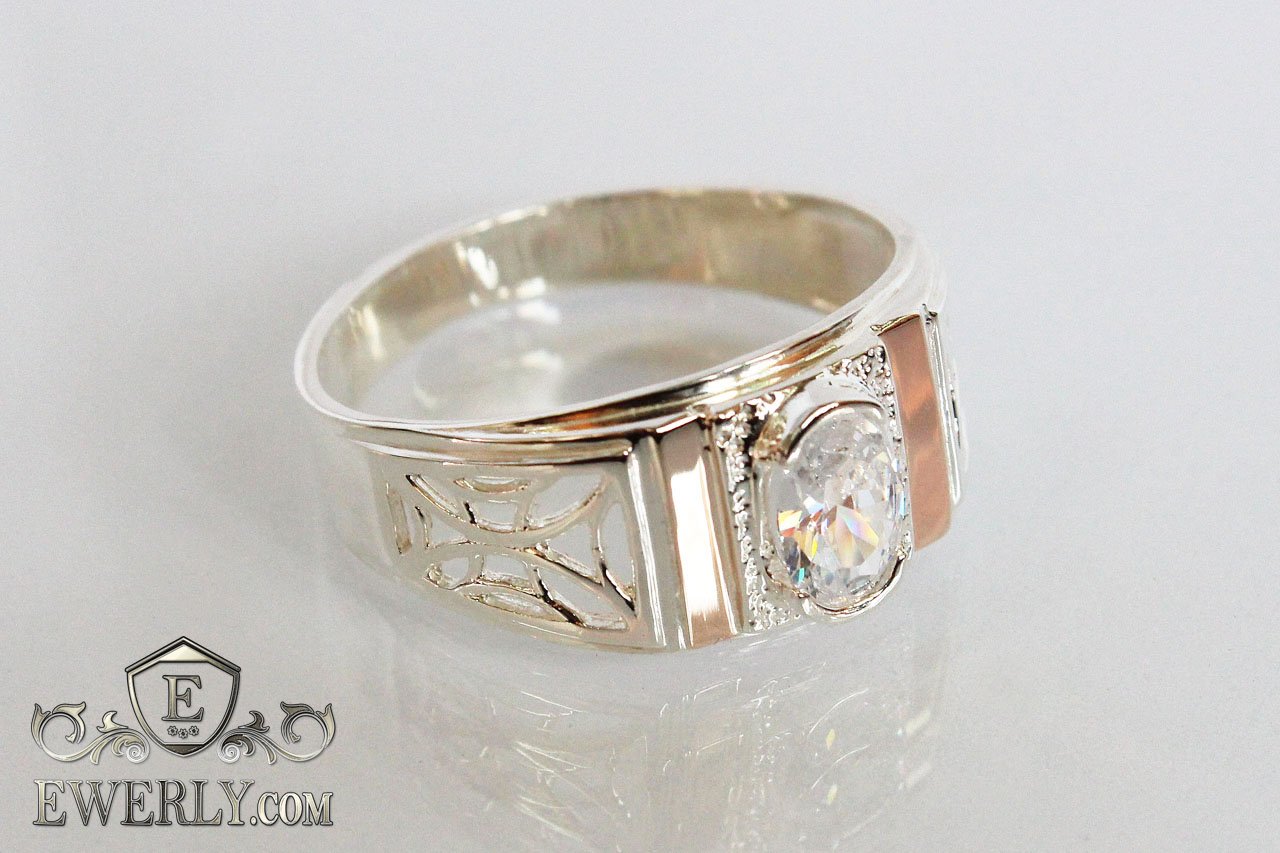 Чоловічий срібний перстень з золотом і білим фіанитом