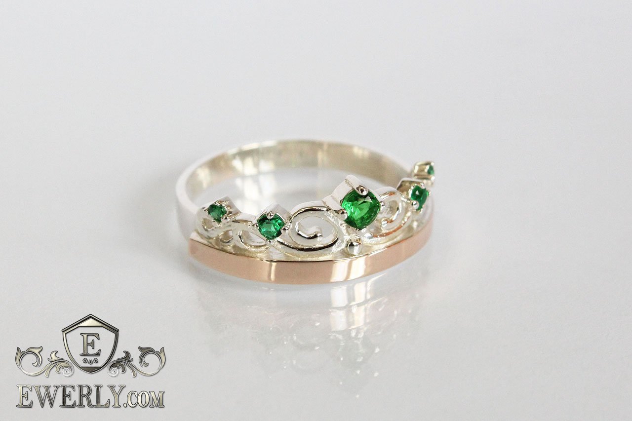 Каблучка «Корона» зі срібла з золотом і зеленими фіанітами