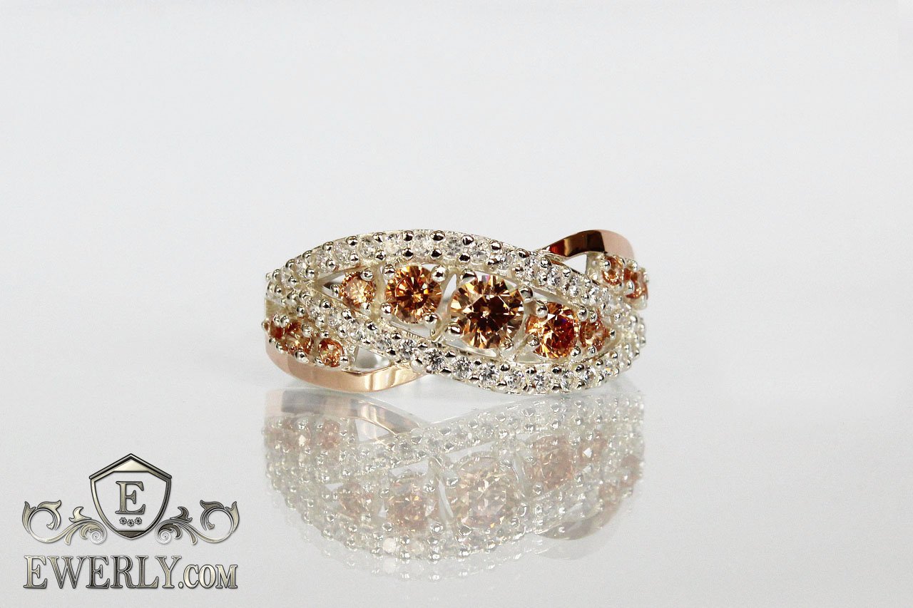 Красиве кільце зі срібла 925 проби із золотими вставками 375 проби та камінням кольору шампань для дівчини.