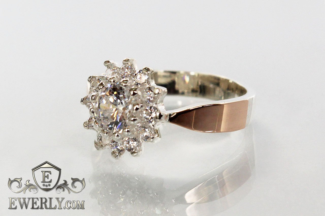 Жіноча срібна каблучка (срібло 925 проби) з золотом 375 проби з білими фіанітами.