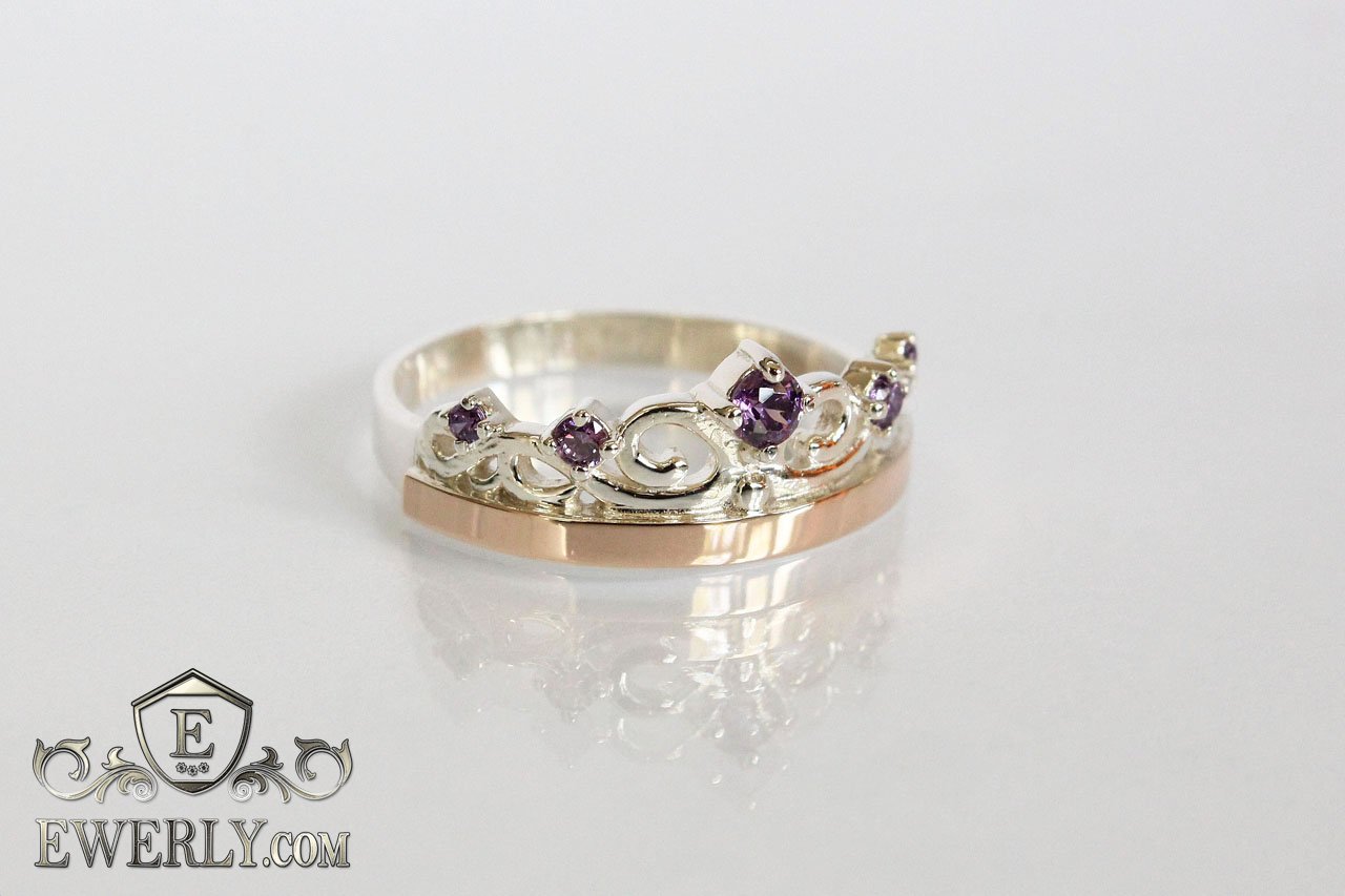 Срібна каблучка «Корона» з золотом і фіанітом кольору аметист (бузковий)