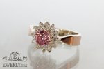 Це кільце поєднує в собі ніжність та виразність — в центрі розташований великий фіаніт рожевого відтінку в багатогранному ограновуванні, що дозволяє каменю буквально сяяти, особливо при сонячному світлі. Великий рожевий камінь оточують білі фіаніти, викладені у формі зоряного візерунка, створюючи ефект м'якого свічення.
