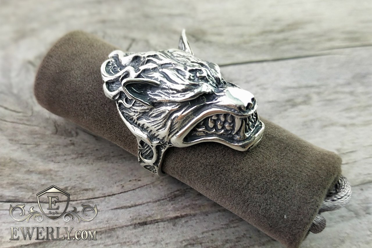 На фото зображено чоловіче срібне кільце з головою вовка (оскал).